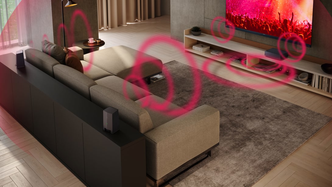 AQUOS Wireless surround speakers work with your compatible SHARP TV, for an enhanced immersive Dolby Atmos® audio experience.